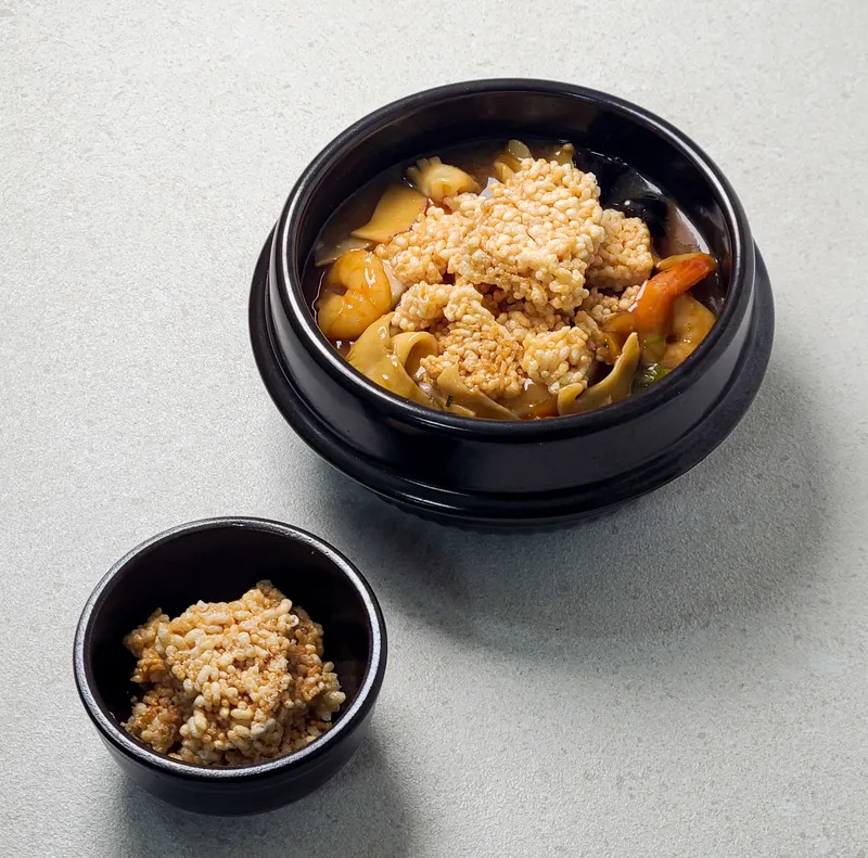 바삭바삭한 튀김 누룽지를 넣어 식감이 더욱 즐거워요. 누룽지만의 고소한 맛이 국물과 어우러져 신선한 조합을 만들었어요.