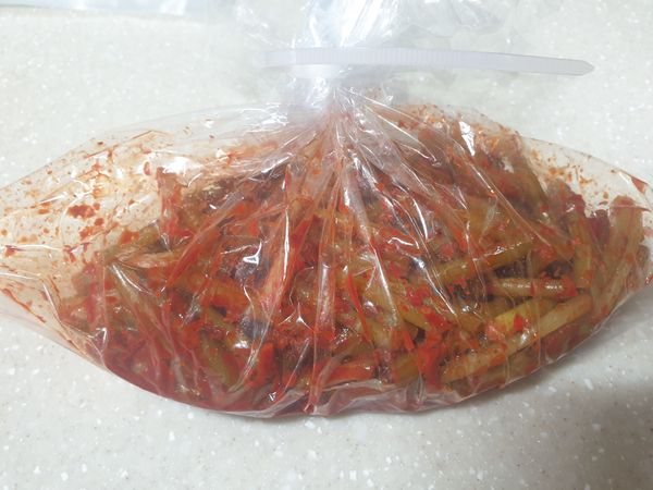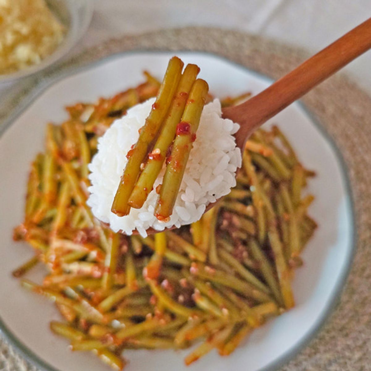 아삭한 식감의 국산 마늘쫑을 천일염에 삭혔습니다. 감칠맛 가득한 비법 양념을 황금비율로 더해 양념이 사이사이 스며들어 잘 어우러졌어요.