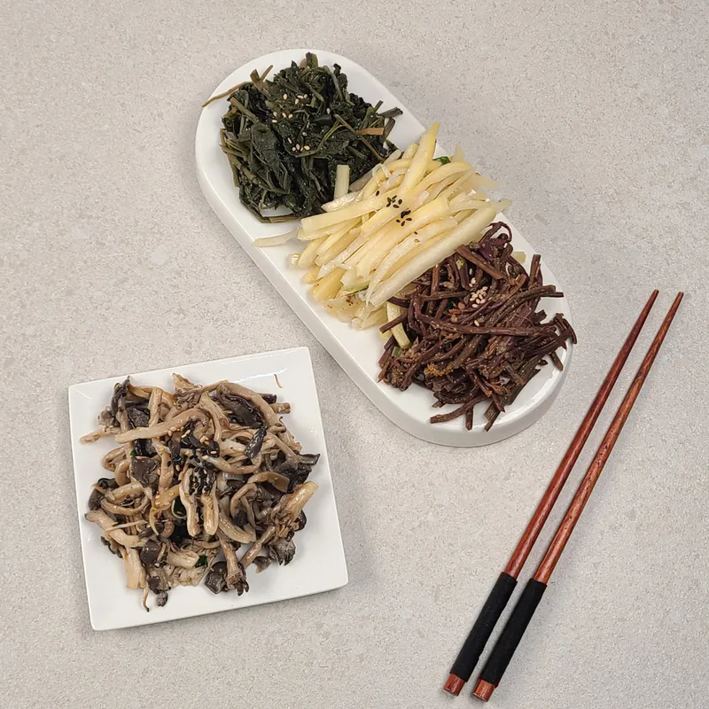 고사리의 쫄깃함, 도라지의 아삭함, 취나물의 구수한 향, 느타리의 부드러움까지! 조화로운 네 가지 반찬입니다.