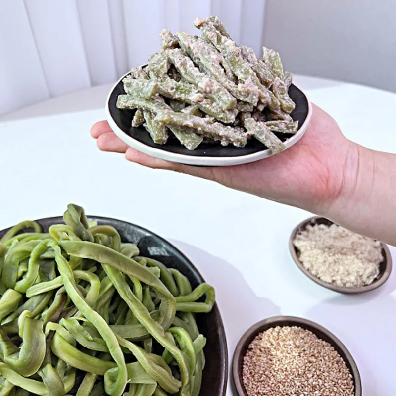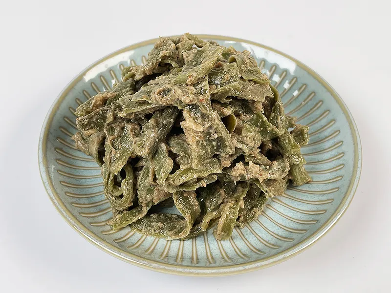 5번 이상 세척한 햇 궁채를 사용합니다. 햇 궁채를 들깨, 참깨, 액젓, 마늘 등으로 양념해 오도독한 식감과 풍미를 모두 잡았습니다.