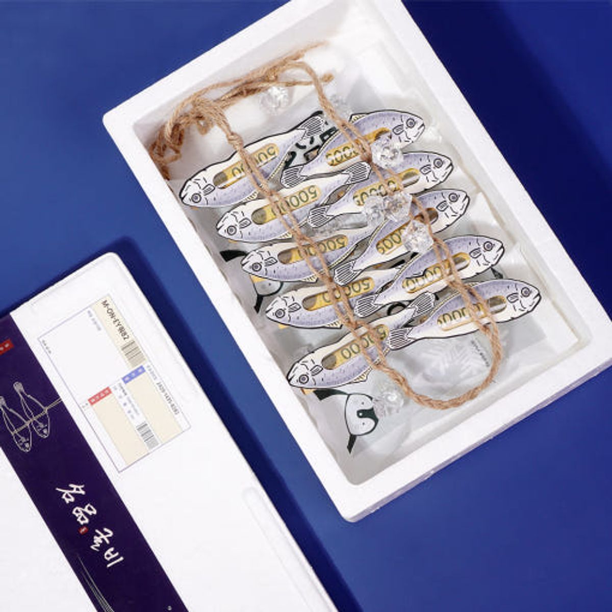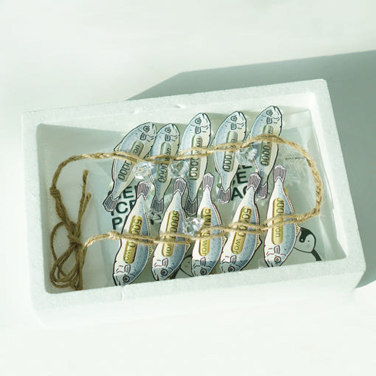 용돈을 넣은 굴비를 끈으로 묶어 정말 굴비처럼 보이게 만들어 보세요! 누군가를 위한 마음으로 직접 손수 준비해 보면 더 좋겠죠? 굴비는 5마리 단위로 길게 엮어 스티로폼 박스에 넣으면 예쁘게 접혀서 들어갑니다.