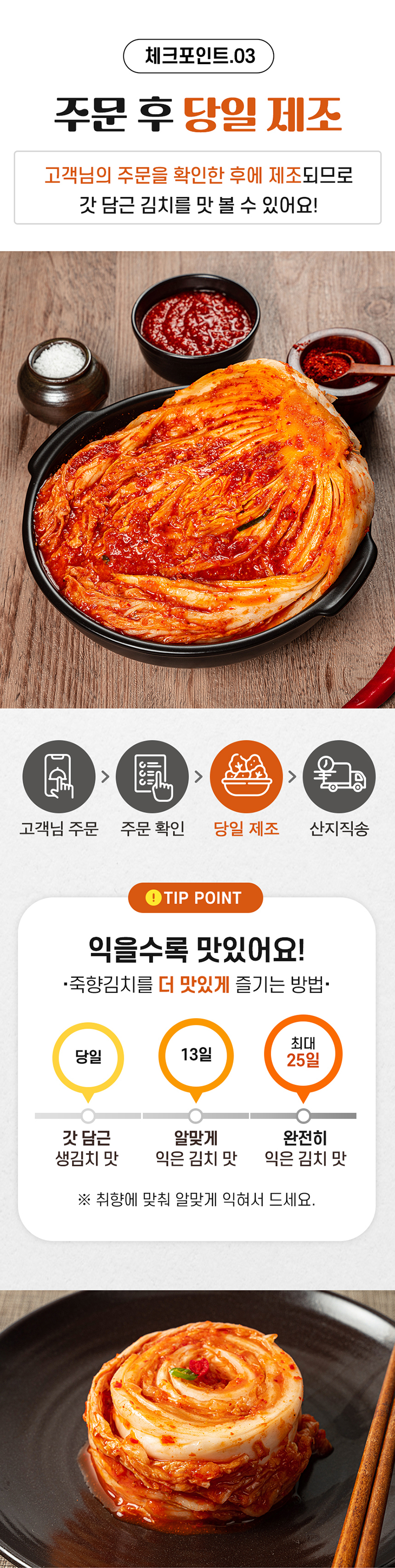전라도 식 김치맛을 원했는데 전혀 그렇지 않아실망 ᆢ배추 절임도 잘안되 배추가 살아있는듯한 느낌 ᆢ배추줄기는 생배추 먹는느낌 ᆢ배추줄기 속에는 양념이 없고 스며들지도 않음 ᆢ