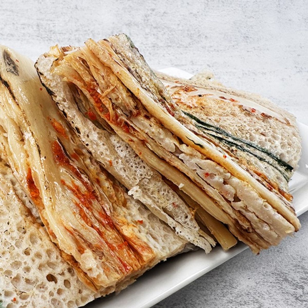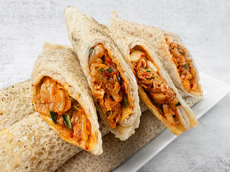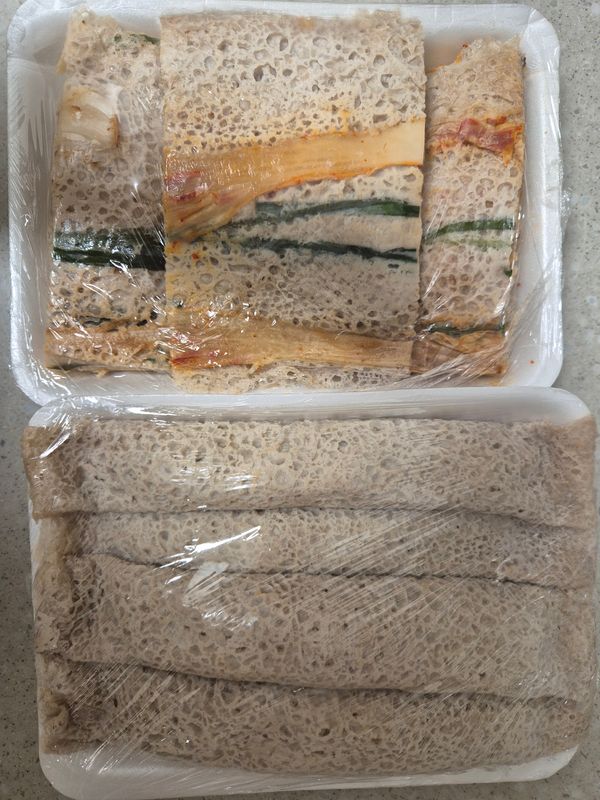 김치를 다져서 매콤하게 양념 된 메밀전병입니다.