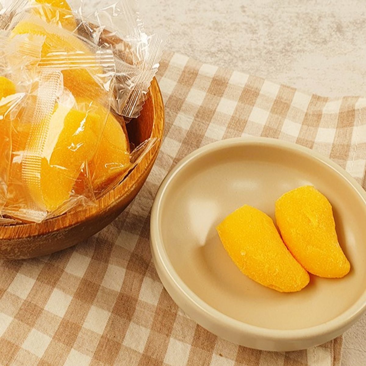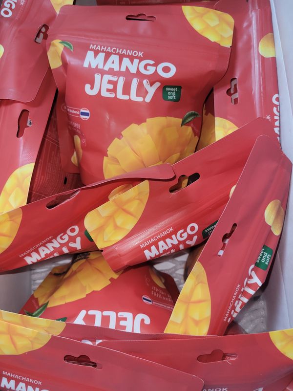 망고의 최대 산지, 태국에서 수확한 망고를 사용해 만든 망고젤리입니다. 망고 퓨레가 무려 60% 이상 함유돼 입 안 가득 향긋하고 달콤한 망고의 맛이 퍼지죠. 망고가 20% 정도 함유된 시중의 다른 제품과는 차원이 다르죠. 말랑말랑 쫀득한 식감에 자꾸 생각나는 매력적인 간식이랍니다.