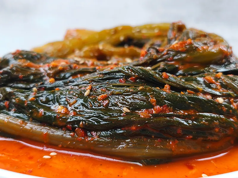 속이 확 풀리는 개운함이 일품인 숙성 갓김치입니다. 아삭아삭한 식감과 함께 톡 쏘는 알싸한 매콤함을 풍겨요.