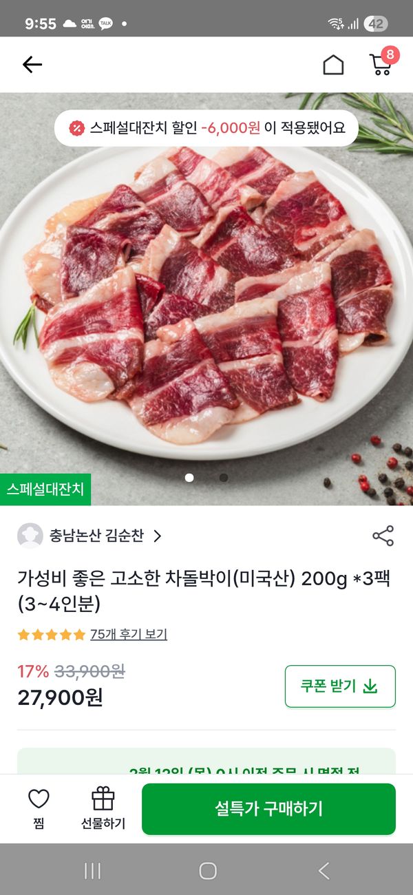 가성비 좋은 고소한 차돌박이(미국산) 200g *3팩 (3~4인분)