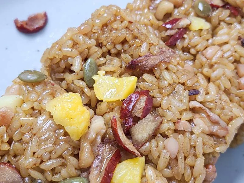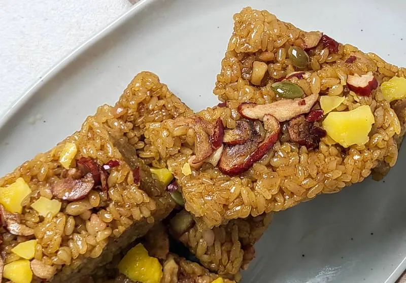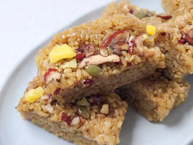 찹쌀로 만들어 쫀득쫀득한 식감이 일품이에요. 은은한 단맛과 고소한 견과류의 풍미가 조화롭게 어우러져 더욱 맛있어요. 한입 베어 물면 달콤한 꿀과 대추 향이 입안 가득 퍼져요.
