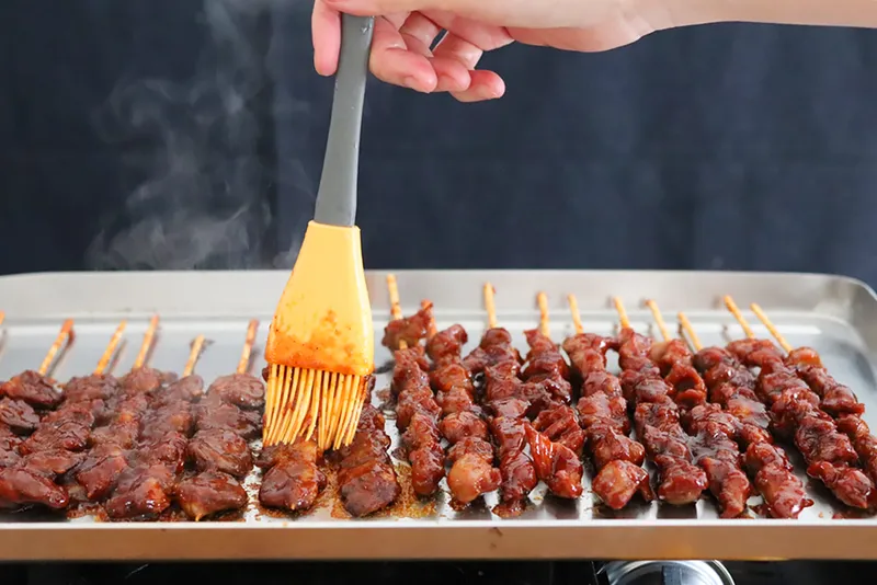 꼬치에 밑간을 한 뒤 센 불을 피해 타지 않도록 앞뒤로 노릇하게 구워 주세요.