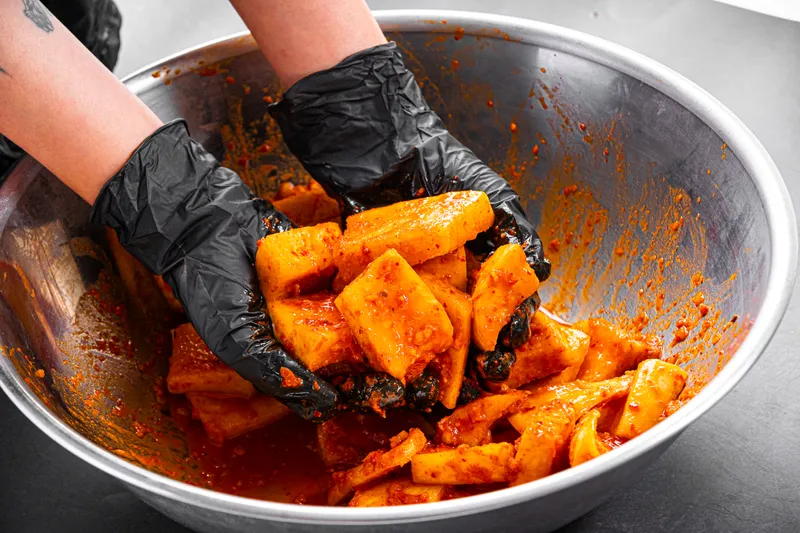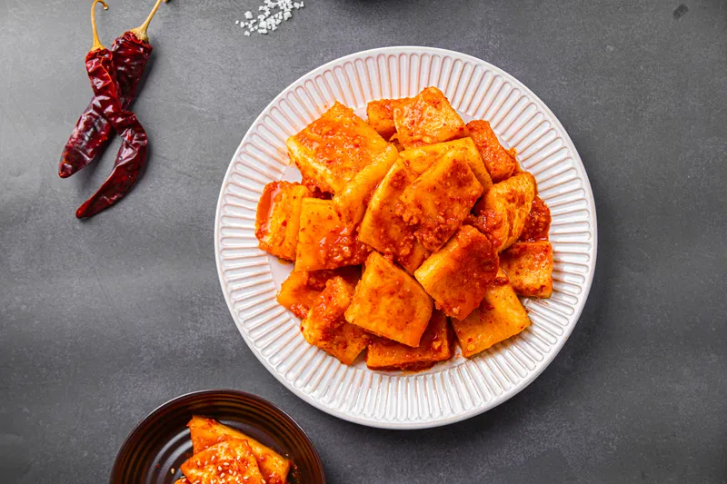 달큼하고 아삭한 매콤 달콤 섞박지입니다. 양념이 잘 베어 들어가 짜지 않고 깔끔해요. 익혀 드시면 깊은 감칠맛을 느끼실 수 있답니다.