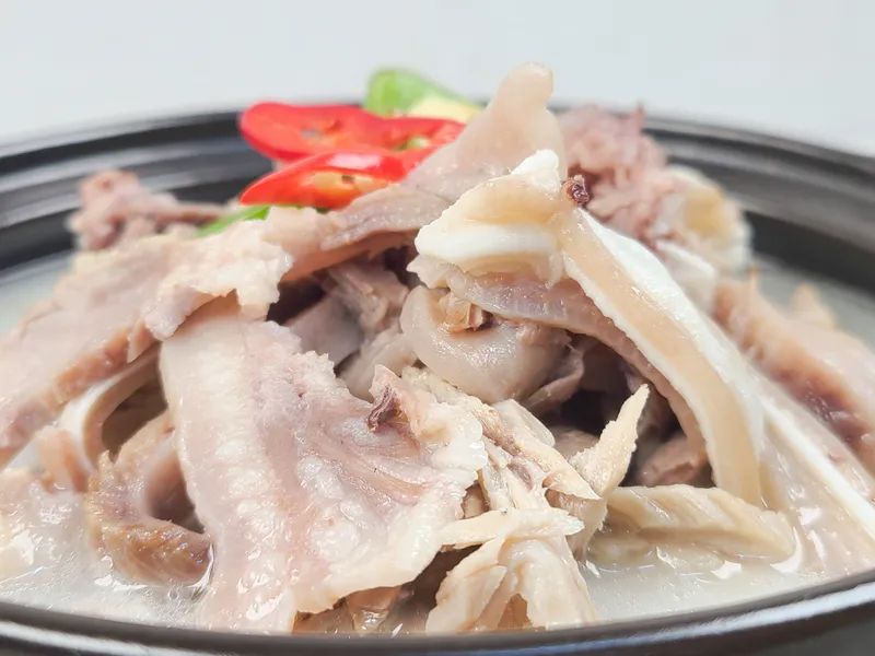 국밥의 원조라고 불리는 돼지국밥입니다. 돼지 머릿고기를 가득 넣어 준비했습니다.