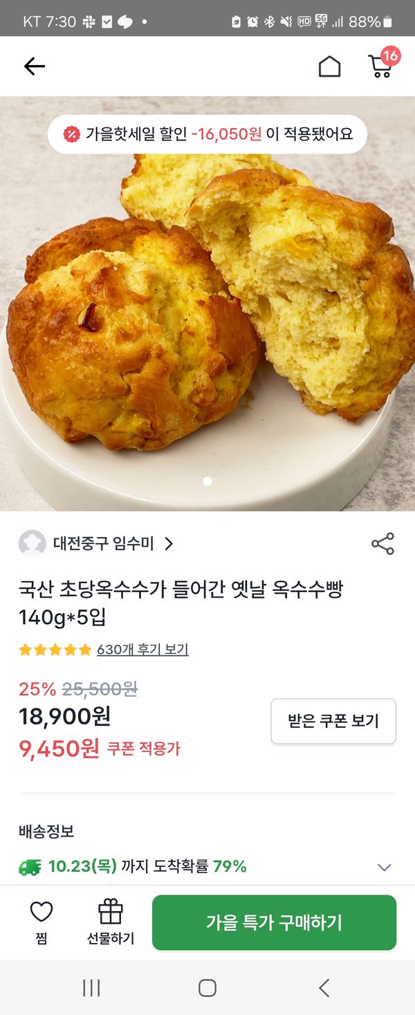 어릴때먹던옥수수빵에대한추억에계속주문하게되는데똑같은맛은아니지만추억의맛이네요그때보다좀더촉촉한느낌이예요군데군데옥수수알갱이도있고재여두고먹게되요