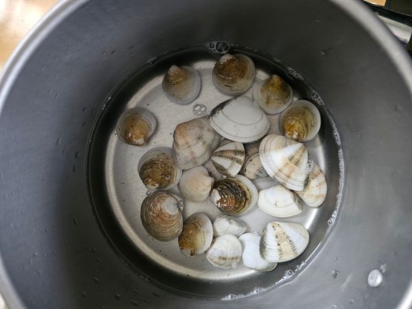 팔도감에서 공수한 비단조개와모시조개로 육수를 우려낸뒤. 백새우넣고 라면을 끓였습니다.