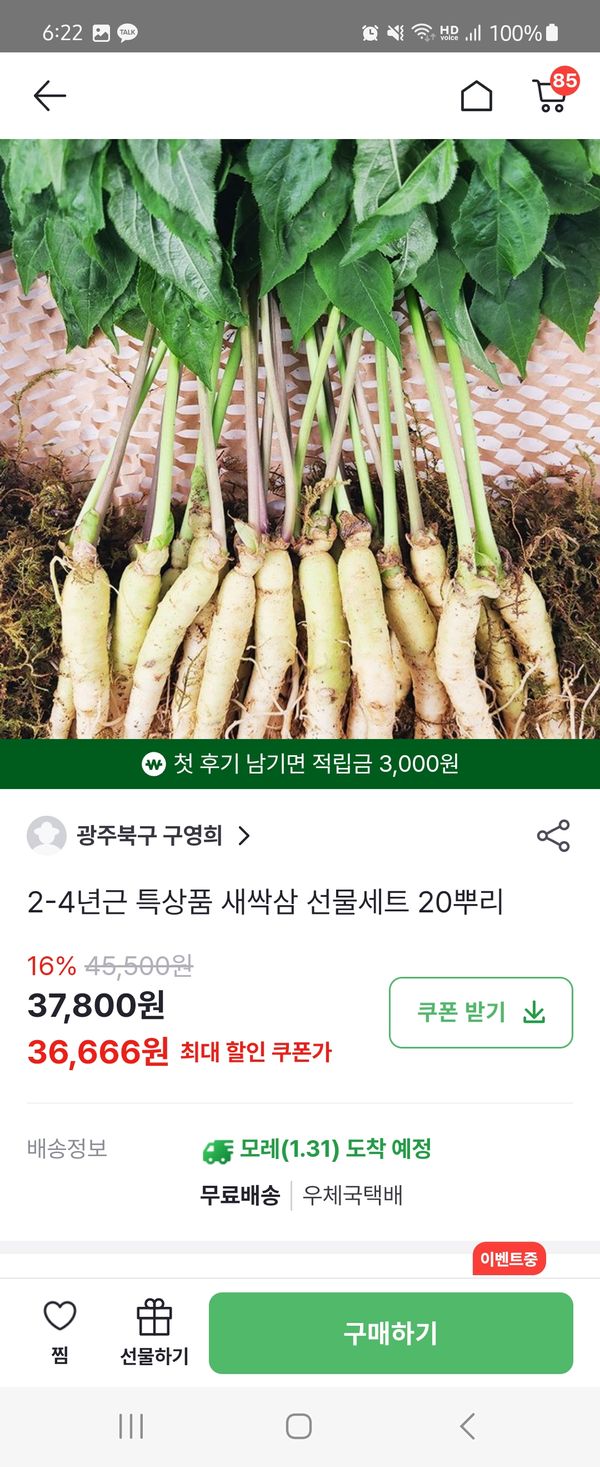 옵션: [24/1/31 수령] 특상품 새싹삼 선물세트 / 20뿌리