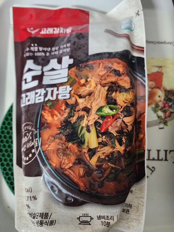 아들과 남편이 쟁여놓으래요. 고기도 많고 매콤하고...먹다가 사진 찍었는데 진짜 맛있음요,재구매하려고요. 진짜 순살감자탕인데 감자는 없는게 남편이 다 드심 제가 늦게 먹었거든요.