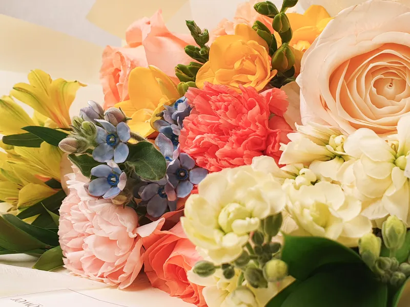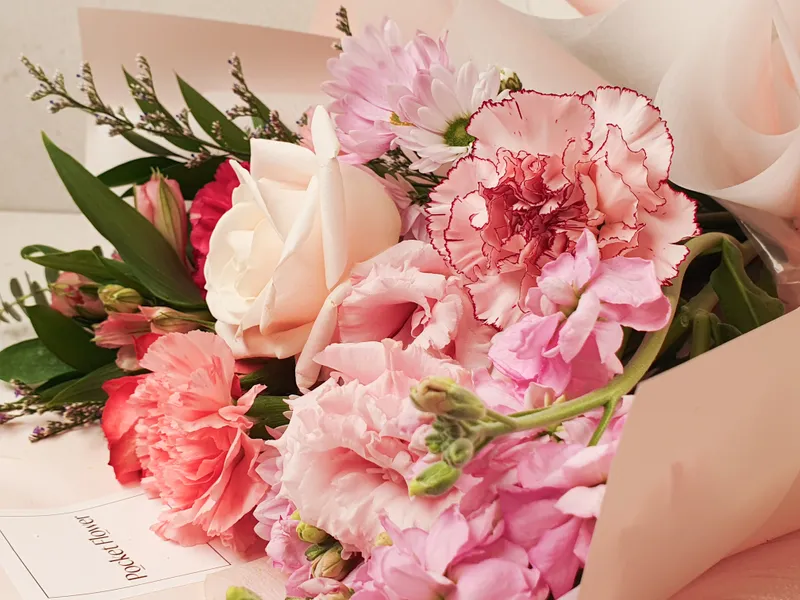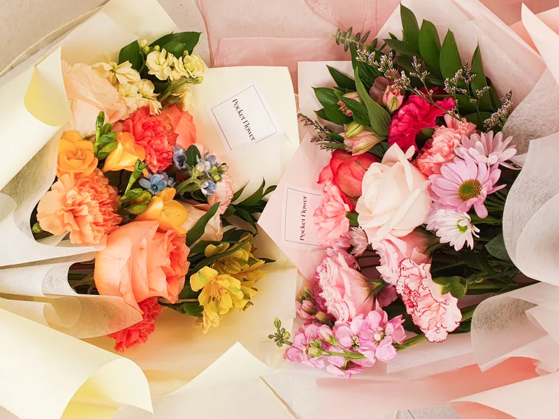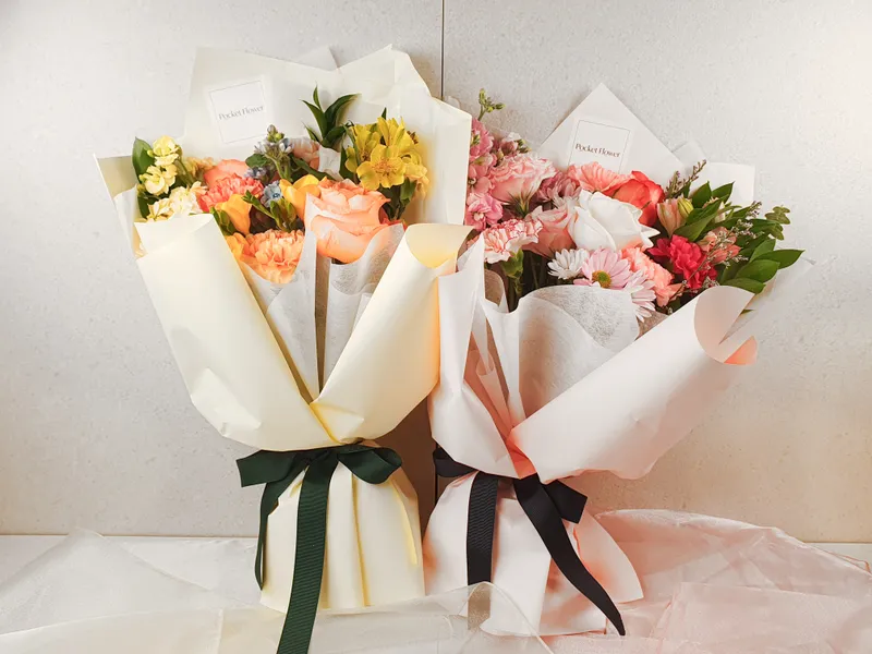꽃다발에 사용되는 수입 장미와 카네이션은 콜롬비아산으로 사계절 내내 일정한 품질을 유지합니다. 화형이 크고 꽃 수명이 길어 고급 꽃다발에 사용되는 고품질 생화예요. 이 외에도 주 3회 경매를 통해 국산 꽃과 소재를 공급받아 전체 꽃다발을 풍성하게 구성하고 있습니다.