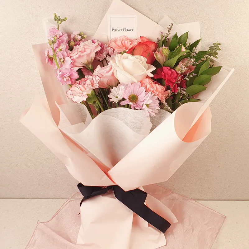 신선한 핑크빛 생화로 구성된 꽃다발입니다. *구성: 미스티블루, 핑크 소국, 카네이션, 리시안셔스, 핑크 장미, 유칼립투스, 루스커스
