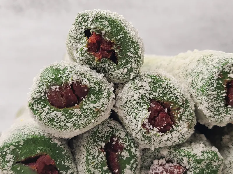 향긋한 쑥 향이 진하게 퍼지는 떡 속에 팥앙금이 가득해요. 겉에는 포슬포슬한 카스테라 가루를 듬뿍 묻혀 은은한 달콤함을 더했답니다.