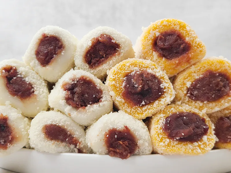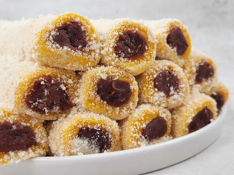 은은하게 호박향이 나는 떡 속에 달콤한 팥앙금이 가득해요. 포슬포슬한 카스테라 가루를 듬뿍 묻혀 완성했어요.