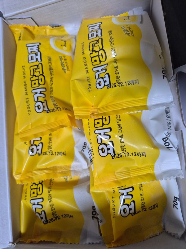 포장 패키지가 깔끔하고 개별 포장이 잘 되어있어 위생에 좋은거 같습니다 해동해서 먹었는데 떡이 쫀득하고 요거트의 상큼함 망고의 달달함이 잘 어울립니다😊