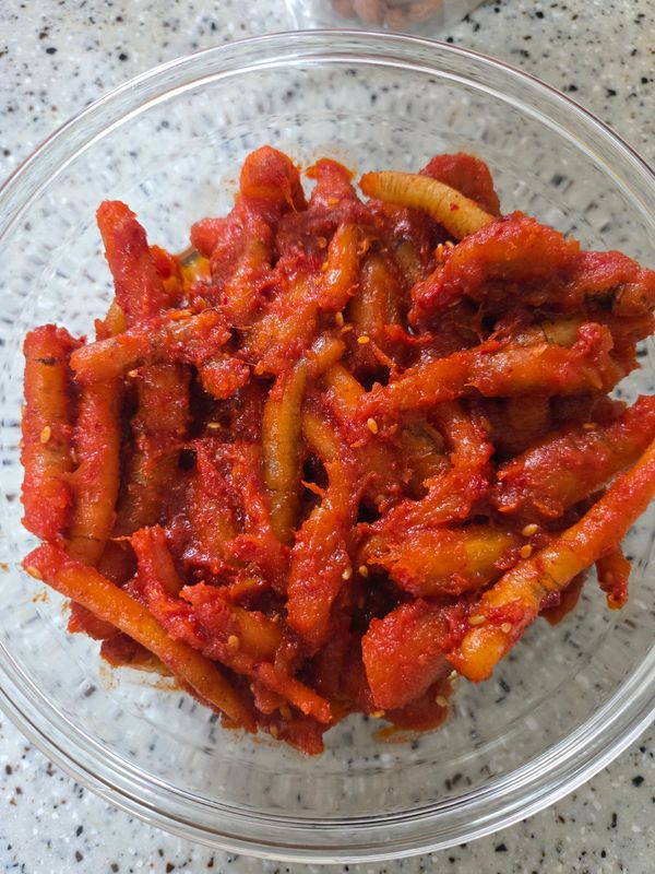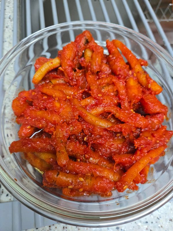 깐깐하게 포장해서 잘 받았구쇼 포장을 제거할수있게 뾰쪽한 도구까지 첨부해주셨어요 명절에 기름진거 먹은 다음에 속을 평정해줄 밙단으로 매콤하거 주문한거였는데 잘 갈무리해뒀다가 설에 먹을겁니다 더덕은 1년생, 아주 잔잔한애들이네요 그 부분이 조금 실망스러웠어요 맛은 단맛이 쎄지않아 만족합니다