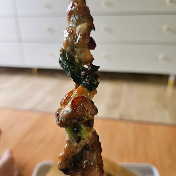 꼬치에 정갈하게 살고기와파가 교차로 잘 꽂혀서 보기에도 먹음직스러워보이네요