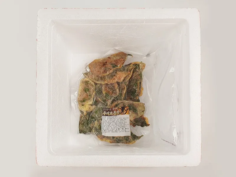 수제전을 부친 후 맛과 향을 그대로 담아 급속 냉동 시켰습니다. 진공 포장으로 냉동실에서 더 신선하게 보관 가능해요.