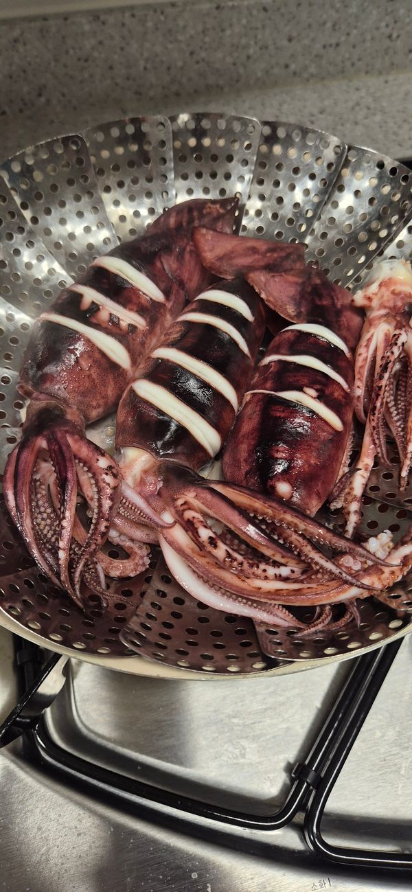 오징어 너무나 신선하고 적당 크기로 잘 왔네요. 지난번엔 무수분으로 쪘는데 이번엔 찜기에 쪘어요. 무수분보다 깔끔하긴하네요. 비린내 안나고 질기지않고 아주 맛있어요.