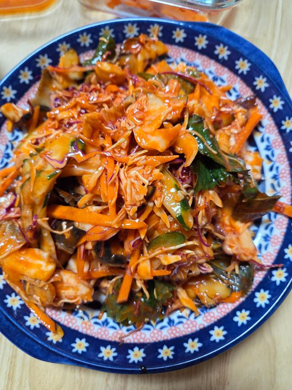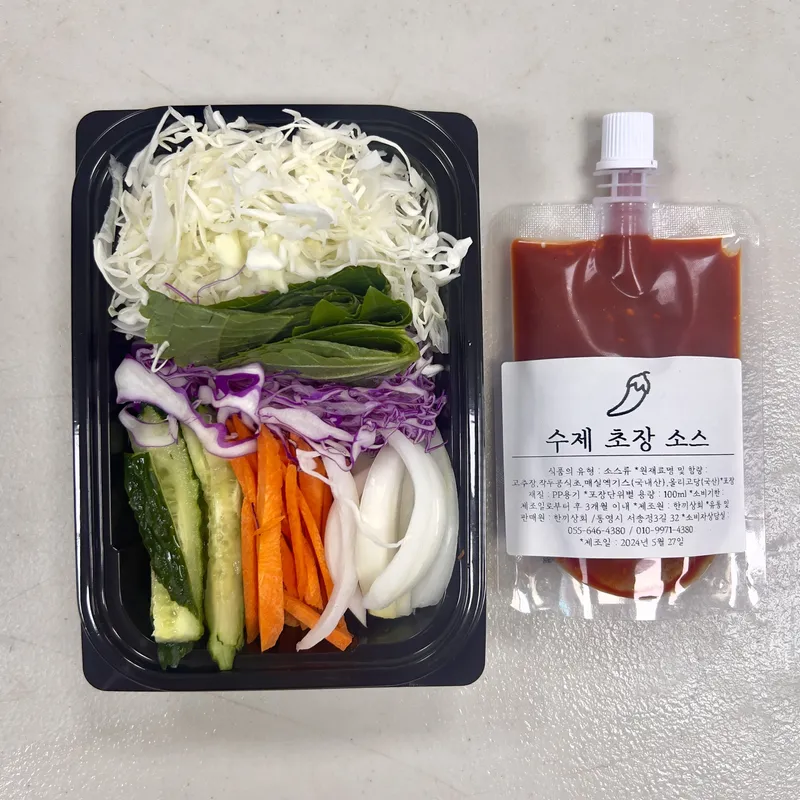 야채 구성은 양배추, 깻잎, 오이, 당근, 양파 입니다.