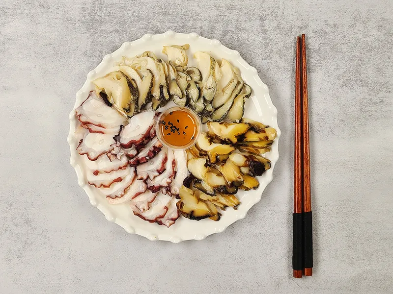 통영 앞바다에서 잡은 돌문어, 뿔소라, 참소라로 구성했습니다. 탱글탱글하고 쫄깃한 식감이 살아있어 씹는 맛이 좋아요.