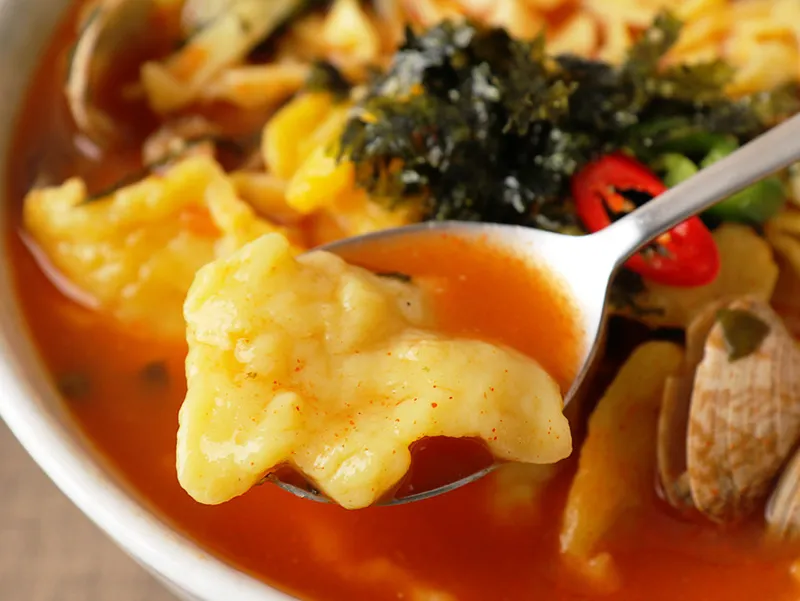 좀 더 매콤하게 즐길 수 있는 수제비예요. 얼큰한 국물의 개운한 맛을 만나보세요.