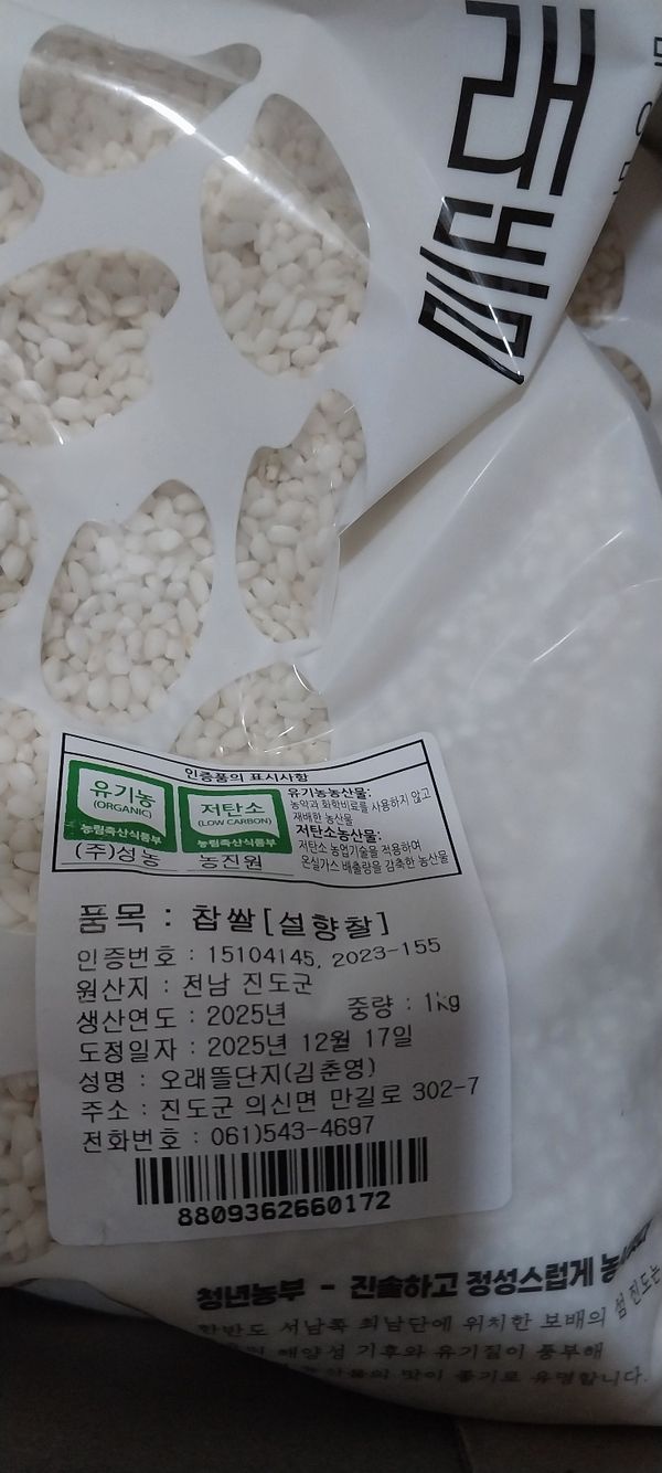 설향찰 유기농찹쌀 잘 받았습니다 아직 억어보지 않았는데 찹쌀 때깔이 넘 좋아보이네요 맛있게 함 먹어보도록 하겠습니다