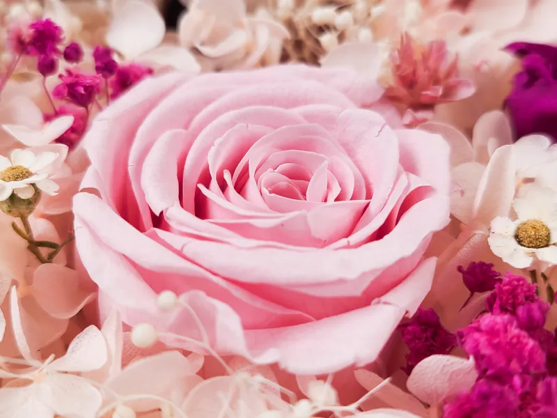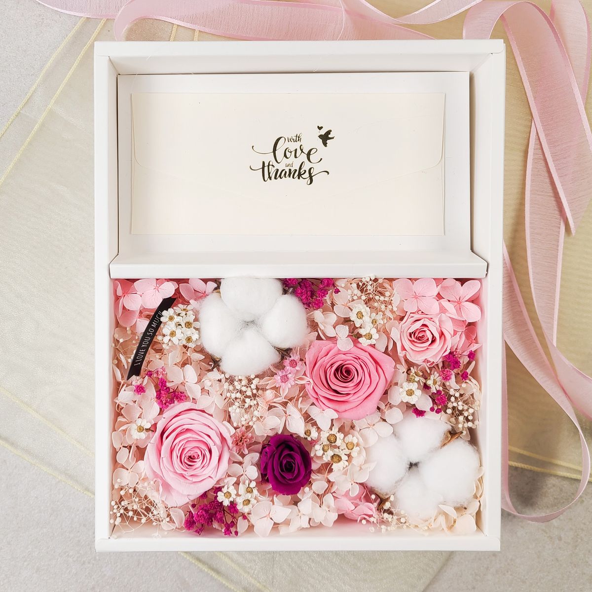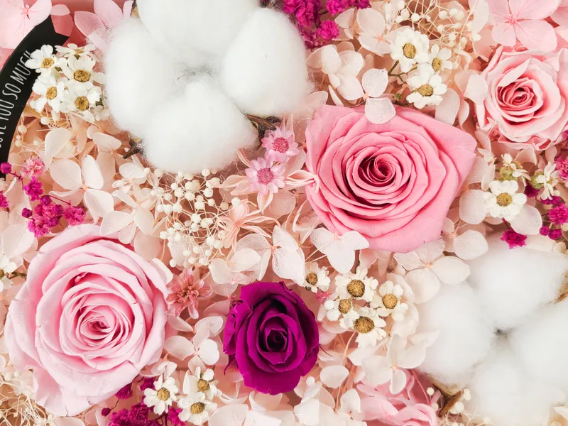 시들지 않는 프리저브드 꽃으로 장식한 용돈 박스입니다. 분홍빛 꽃과 깔끔한 봉투 구성으로, 용돈이나 상품권을 고급스럽게 담아 전달하기 좋아요. 분홍색 리본으로 묶어 마무리해 주세요 😊