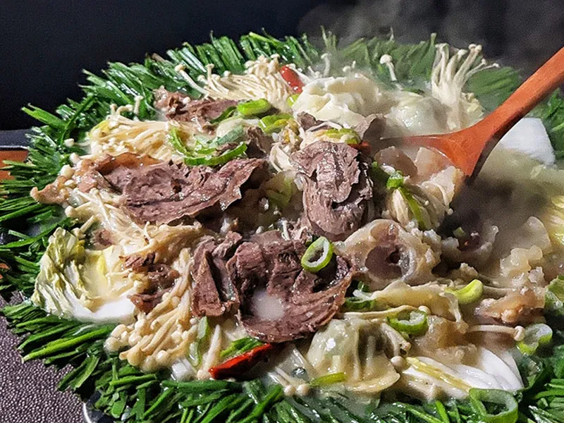 진한 사골육수에 자체 개발한 칼칼한 비법 소스를 더해 느끼하지 않고 얼큰한 맛이 살아 있어요. 처음부터 끝까지 질리지 않는 전골 맛의 핵심이랍니다. 맵기 정도는 조절할 수 있어 입맛에 맞게 즐기실 수 있어요.
