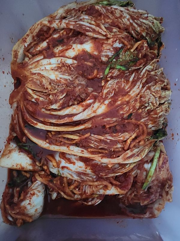 박스는 파손되어 와서 개봉할때 조심조심 조마조마했지만 상품우 안전했어요~^^ 추석때먹을 포기김치를 너무빨리시킨거 아닐까 걱정반 익은게오면 안되는데하면서 맛을 보는데 어머낫. 요건 바로 버무려서 보내셨나봐요?무채가 살아있네요 ㅋㅋ 속하나 뜯어서 하나 싸먹으며 맛봤는데 짜지도 않고 간도 딱맞고 수육만있으면 금상첨화겠드라구요 ㅋㅋㅋ 저녁식탁에 쭉쭉찢어 흰쌀밥에 척척얹어 밥한그릇 뚝딱 했네요. 갓담은 김장 김치에요. 찜해뒀다겨울 김잠때도 올께요^^