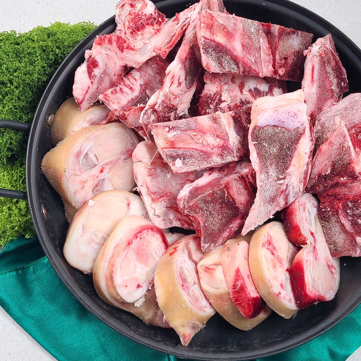 곰거리의 진수를 느낄 수 있는 신선한 한우 부위 세트입니다. 사골, 우족, 반골, 잡뼈까지 다양한 부위로 구성되어 풍성한 맛을 즐길 수 있어요. 각 부위의 고소하고 깊은 맛이 한 접시에 담겼습니다.