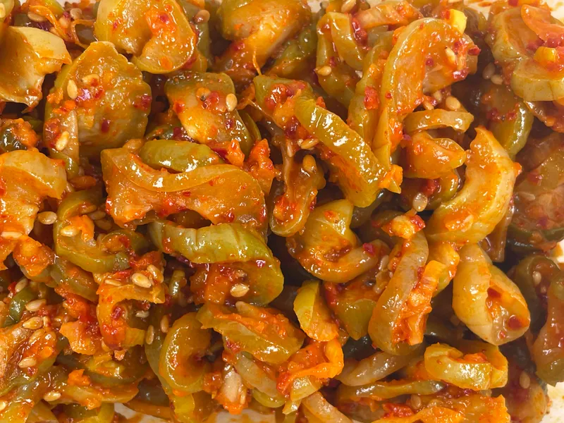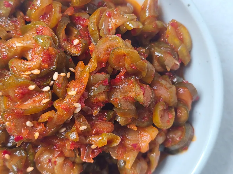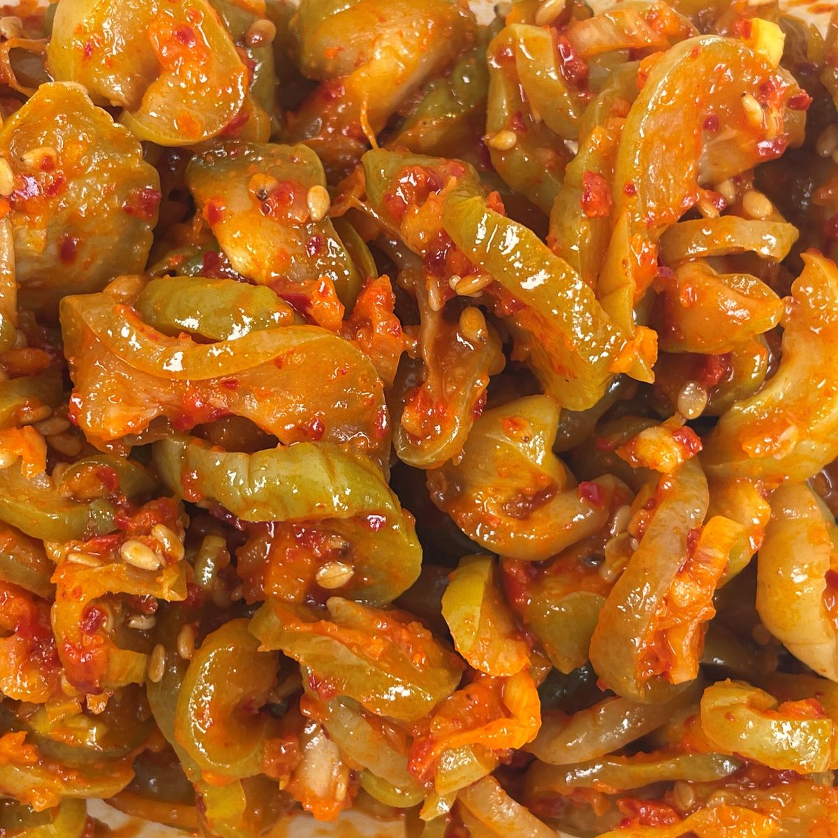 꼬독한 식감과 새콤달콤한 맛이 매력적인 오이지무침입니다. 자극적이지 않으면서 정갈한 밑반찬으로 계속 손이 갈 거예요. 화학조미료를 일절 사용하지 않고, 고춧가루·다진 마늘·참기름 등으로 만든 수제 양념장으로 건강한 맛을 냈습니다.