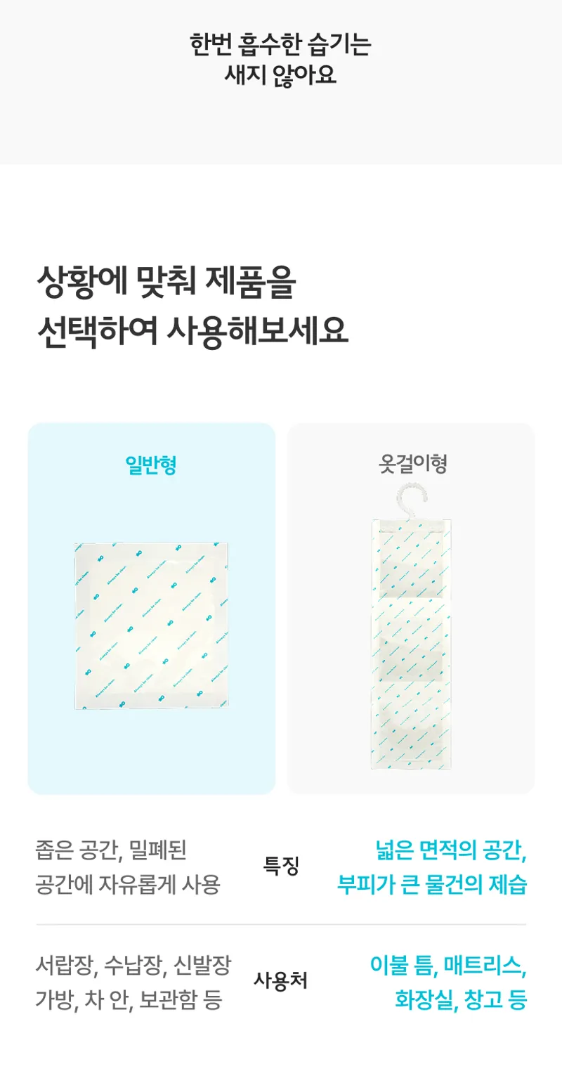 옷걸이용이랑,,일반용을 원플러스원데이때 사서 여기저기 곳곳에 잘 사용하게되었어요~기존에 제습제들보다 깔끔하고 부피가 작아서 사용하기에 편하고 좋아요~