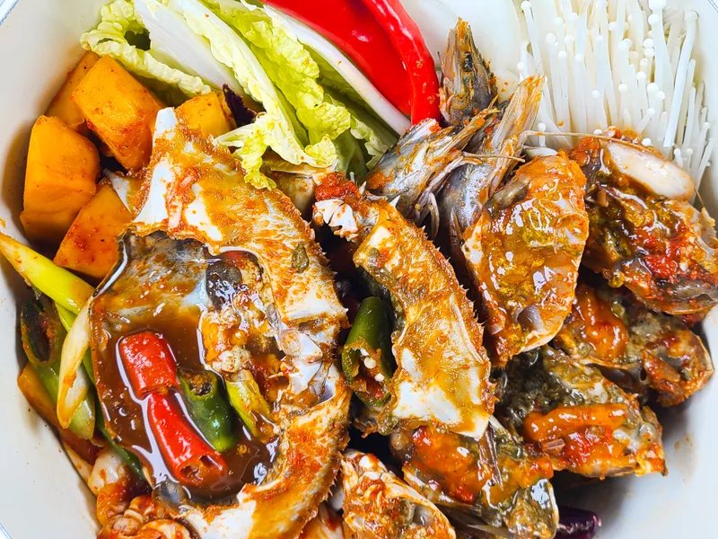 게국지는 충청남도의 대표적인 향토음식으로, 게장 국물을 김치와 함께 끓여 낸 음식을 말합니다. 게와 새우를 통째로 넣어 슴슴하기보다 진한 갑각류의 국물 맛이 일품이죠. 여기에 배추, 늙은호박 등 신선한 야채를 넣어 더욱 시원한 국물 맛을 표현했습니다.