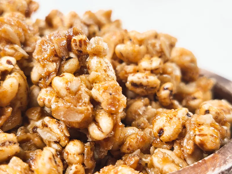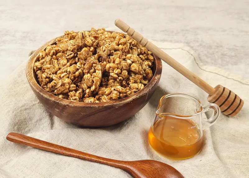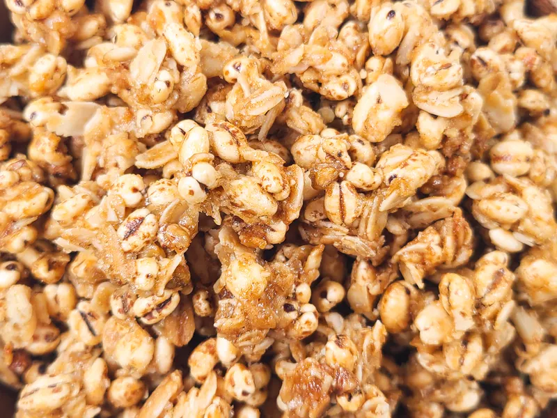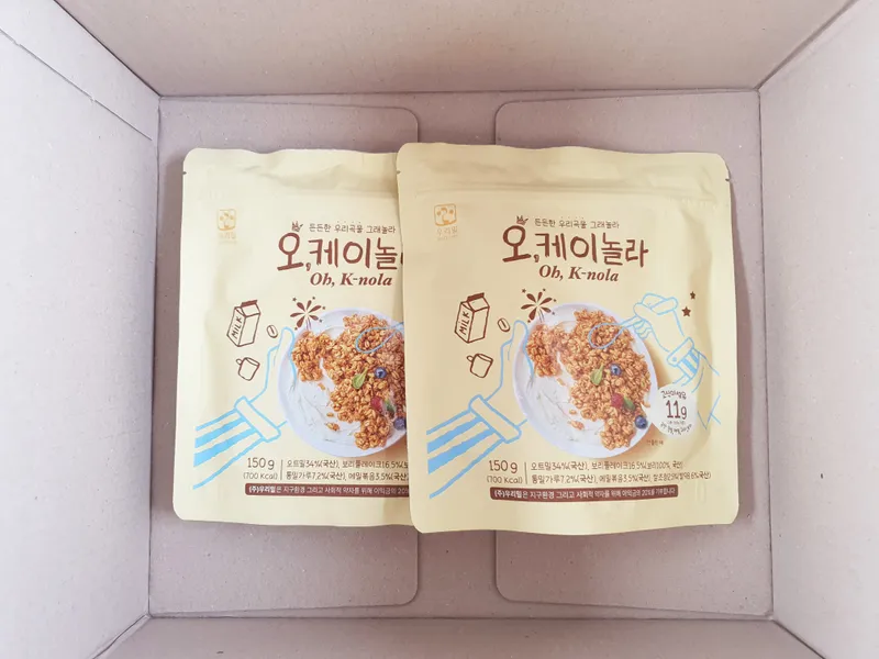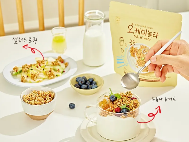 스페인산 올리브유로 바삭한 식감과 국산 쌀조청과 메이플시럽으로 은은한 달콤한 맛을 냈고요. 국산 곡물 4종(보리, 통밀가루,메밀,귀리) 그래놀라로 맛과 식이섬유를 채우고 지방은 덜었답니다👍 사과보다 4배 식이섬유가 풍부해요!