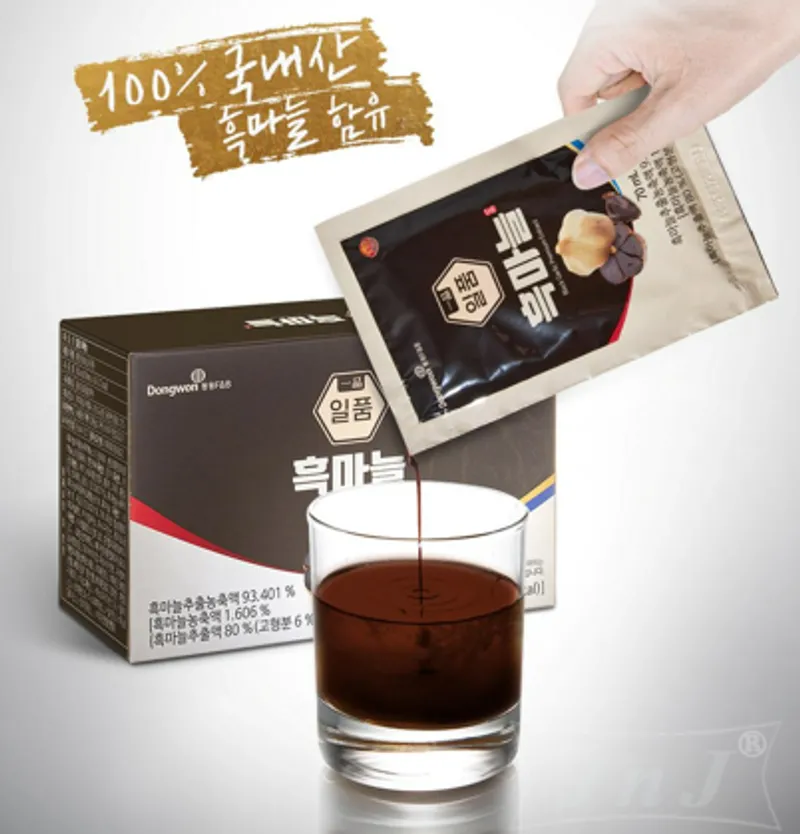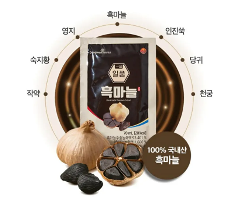 100% 국내산 흑마늘을 그대로 갈아 넣었습니다. 흑마늘뿐만 아니라 인진 쑥, 당귀, 천궁, 작약, 숙지황, 비타민 C 등 엄선된 부원료만 담아 더욱 든든하답니다. 흑마늘의 알싸하고 진한 맛 넘치는 건강한 풍미를 느껴보세요.