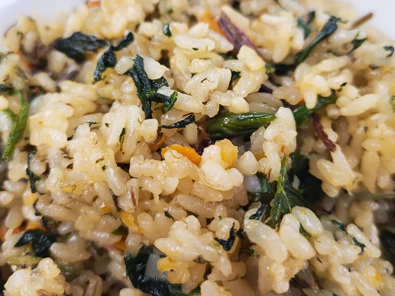짭짤한 간장 소스와 듬뿍 들어간 국산 곤드레가 만나 고소한 맛이 일품이에요.