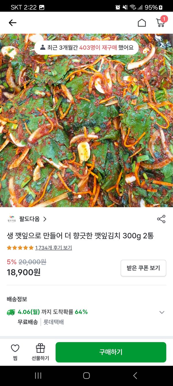 생깻잎 한장 한장 양념이 다 발라져있어서 향긋하고 짜지 않고 너무 맛있어서 또 주문했어요. 그런데 2+1이 아니라 아쉬웠네오.ㅋㅋ