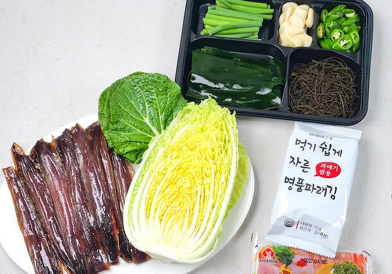 과메기, 야채, 초고추장, 파래김으로 구성되어 있습니다.