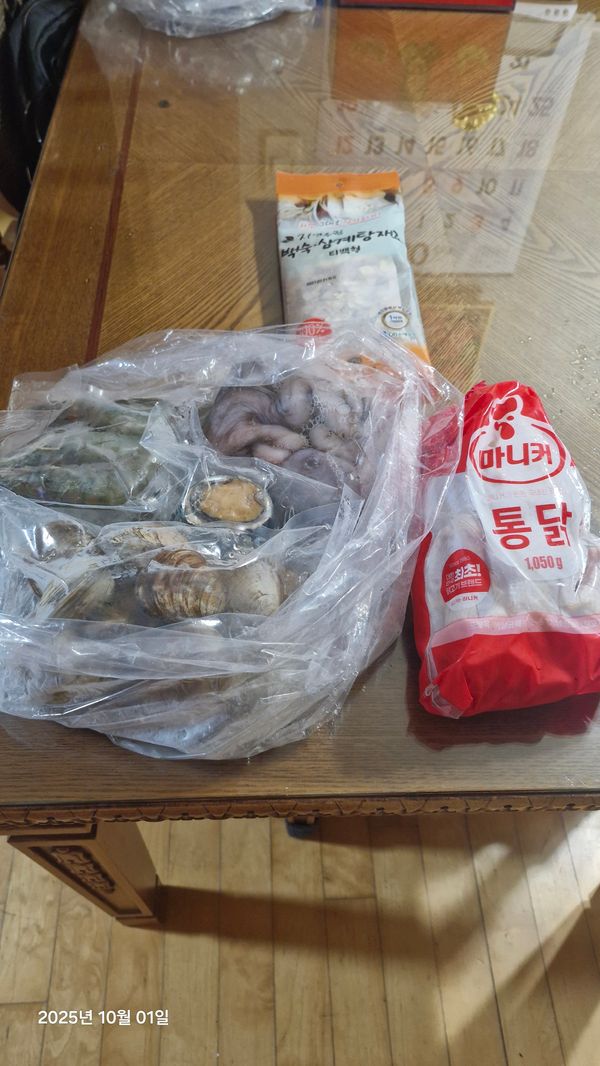 신선하고 구성이 알차네요. 상세한 팁이 적힌 안내문 따라 했더니 큰 어려움없이 해신탕을 집에서 해먹어 봤습니다. 잘 먹는 성인 세명이서 먹었는데 양이 생각보다 많아 국수는 손도 못 대었습니다. 칼국수까지 해서 4-5인이 먹으면 충분할거 같아요.