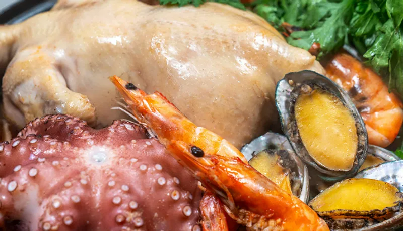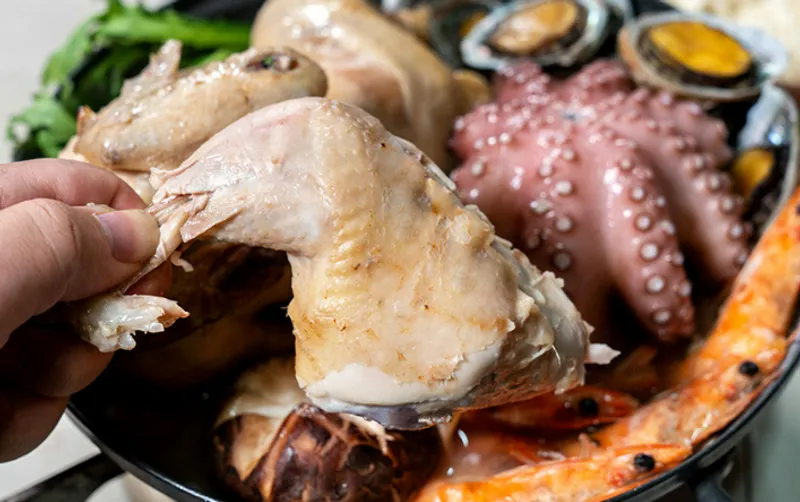1. 닭을 세척해 주세요. (날개 끝과 꽁지 부분을 잘라주시면 특유의 누린내나 기름을 줄일 수 있어요) 2. 전복은 솔로 깨끗하게 닦고 새우도 세척해 주세요. 3. 한약재 팩과 닭을 넣고 30~40분 정도 끓여주세요. (한약재 팩을 너무 오래 우려낼 경우 육수에 쓴맛이 날 수 있으니 건져주세요) 4. 닭이 익으면 해산물을 넣고 10분 정도 더 끓여주세요.