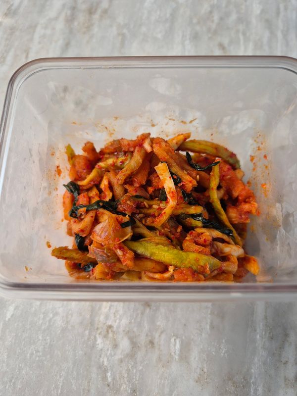꼬들꼬들한 것까지는 좋았는데 맛이 없네요. 단맛도 짠맛도 매운맛도 부족한 어중간한 맛. 색깔도 맛갈스럽지않고... 식구들이 한번씩 먹어보더니 더이상 젓가락이 가질 않네요.