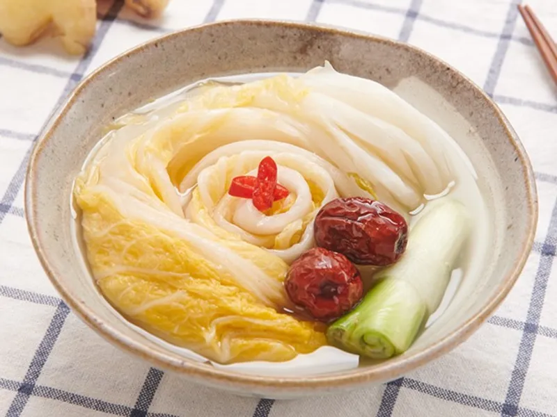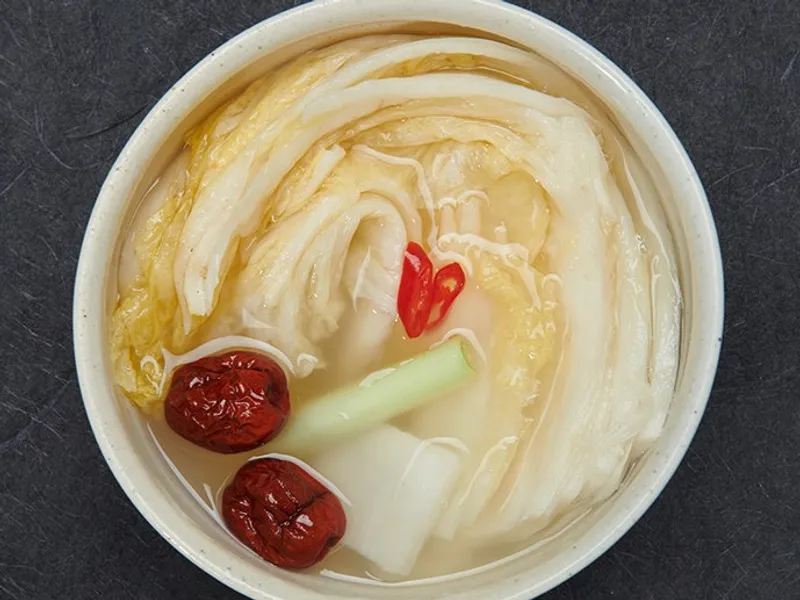 겉잎이 시들지 않고 윤기가 흐르는, 속이 꽉 찬 배추만 엄선해 은은한 단맛이 납니다. 백김치이지만, 양념이 들어가는 김치만큼이나 풍부한 재료를 넣어서 국물을 만들기 때문에 깊고 개운한 맛을 느낄 수 있습니다.