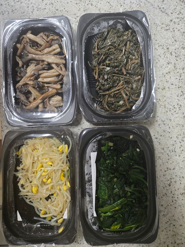 콩나물은 파한쪽도 보이지않고 생으로 보낸줄알고 놀라고 양도 바닥에 깔리기만해서 또한번 깜놀 다른 나물은 양념들이 같이 어우러져서 맛있게 잘먹었습니다