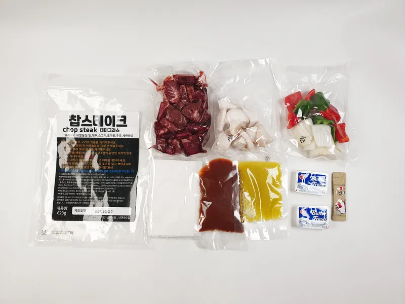 찹스테이크에 필요한 모든 재료를 담아 준비했어요. 조리법 대로 간편하게 조리만 해주면 누구나 금방 맛집 못지않은 찹스테이크를 완성할 수 있답니다. 밀키트 하나로 일일이 재료를 사야 하는 수고를 확 줄였어요😉