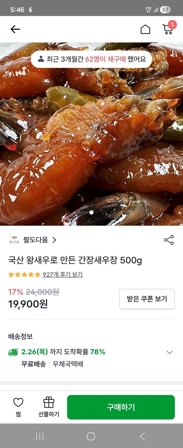 포장상태도 좋고 배송도 빠르고 좋았습니다. 간장새우는 짜지않고 깔끔하네요